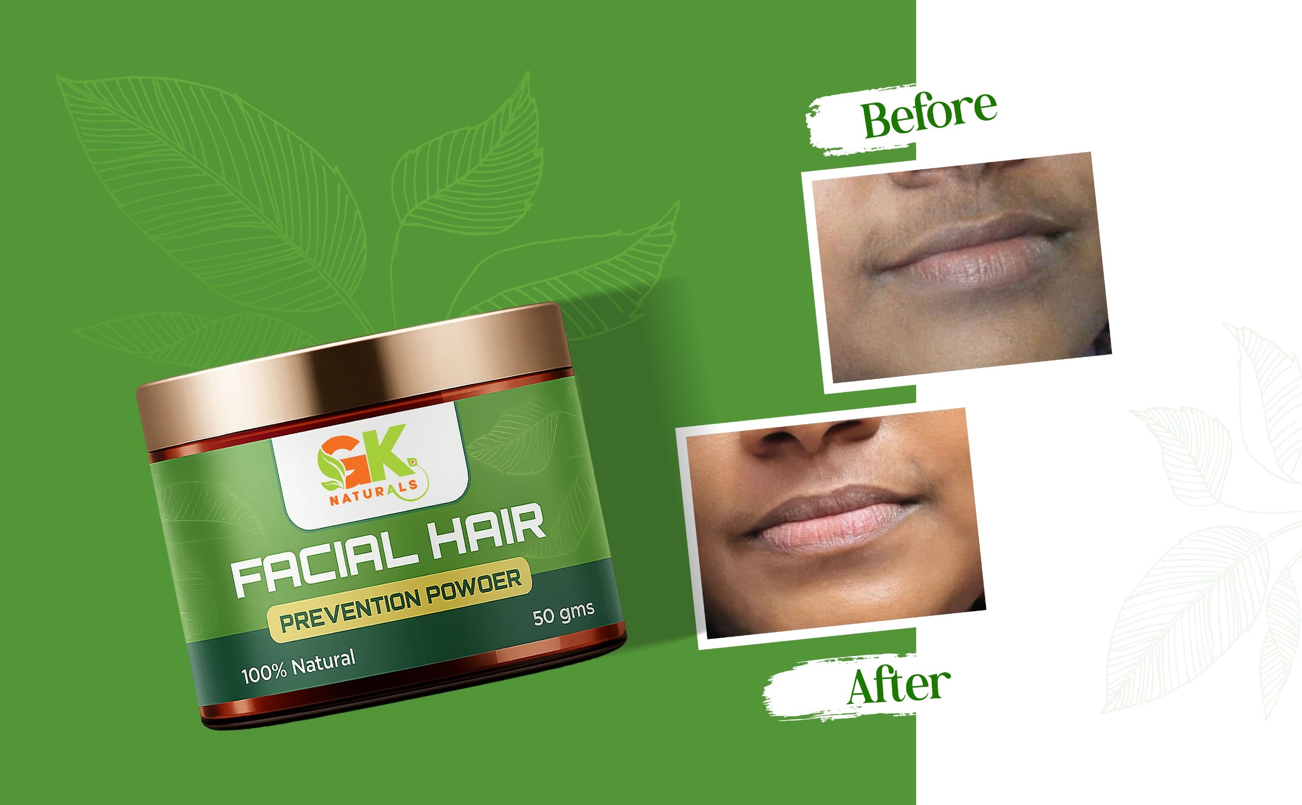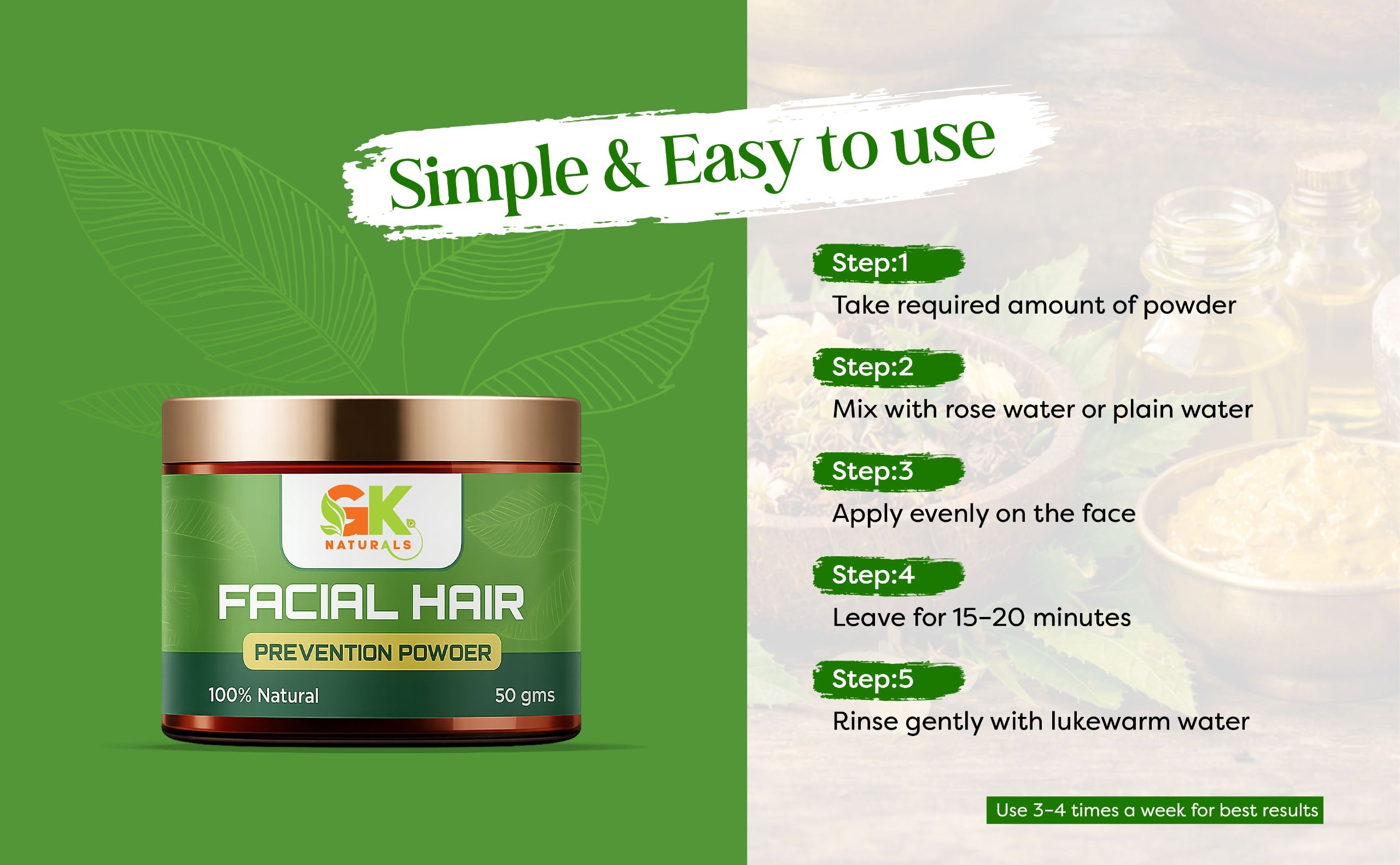 An Ayurvedic and innovative solution designed to help reduce unwanted facial hair growth. This powder is specially formulated to diminish the appearance of facial hair and provide a smooth, hair-free complexion. Contains ingredients like kasthuri manjal, Neem powder, kuppaimeni powder, and rose petal powder.