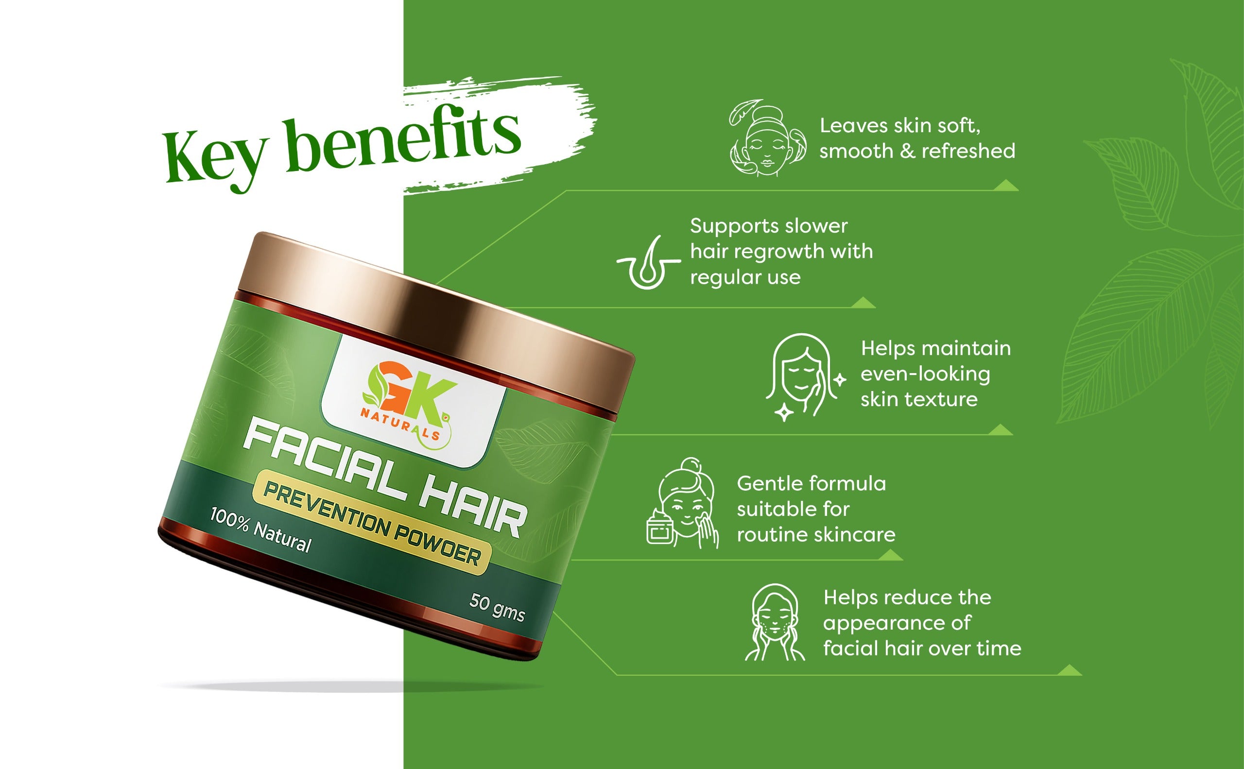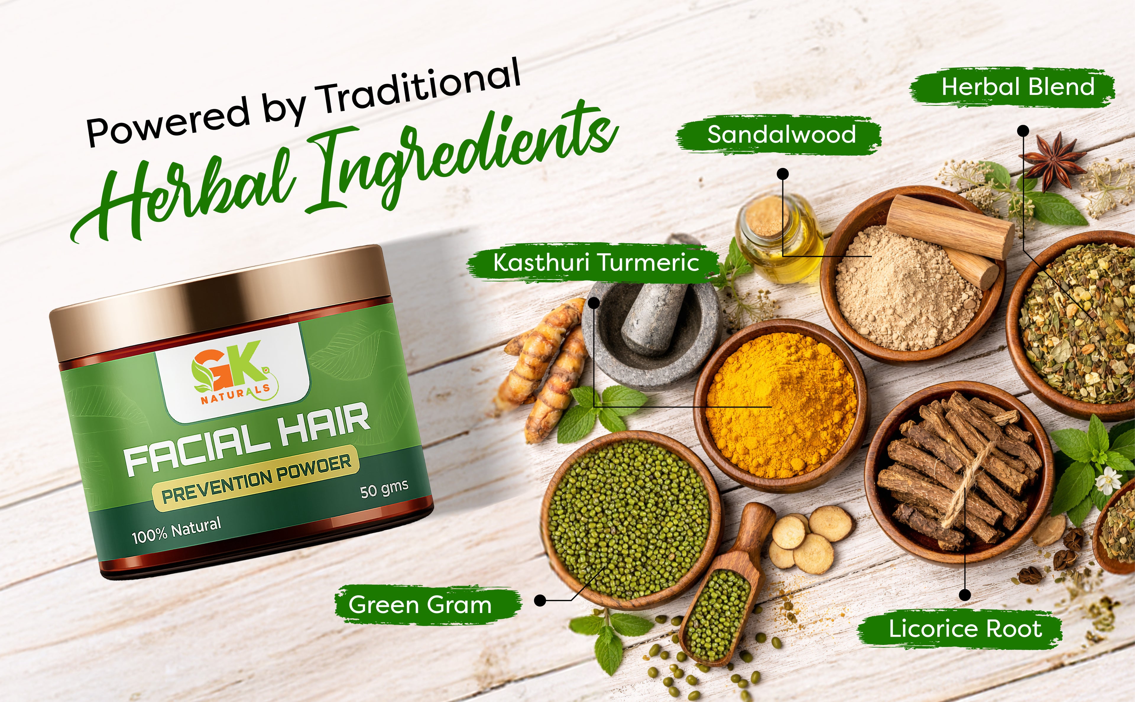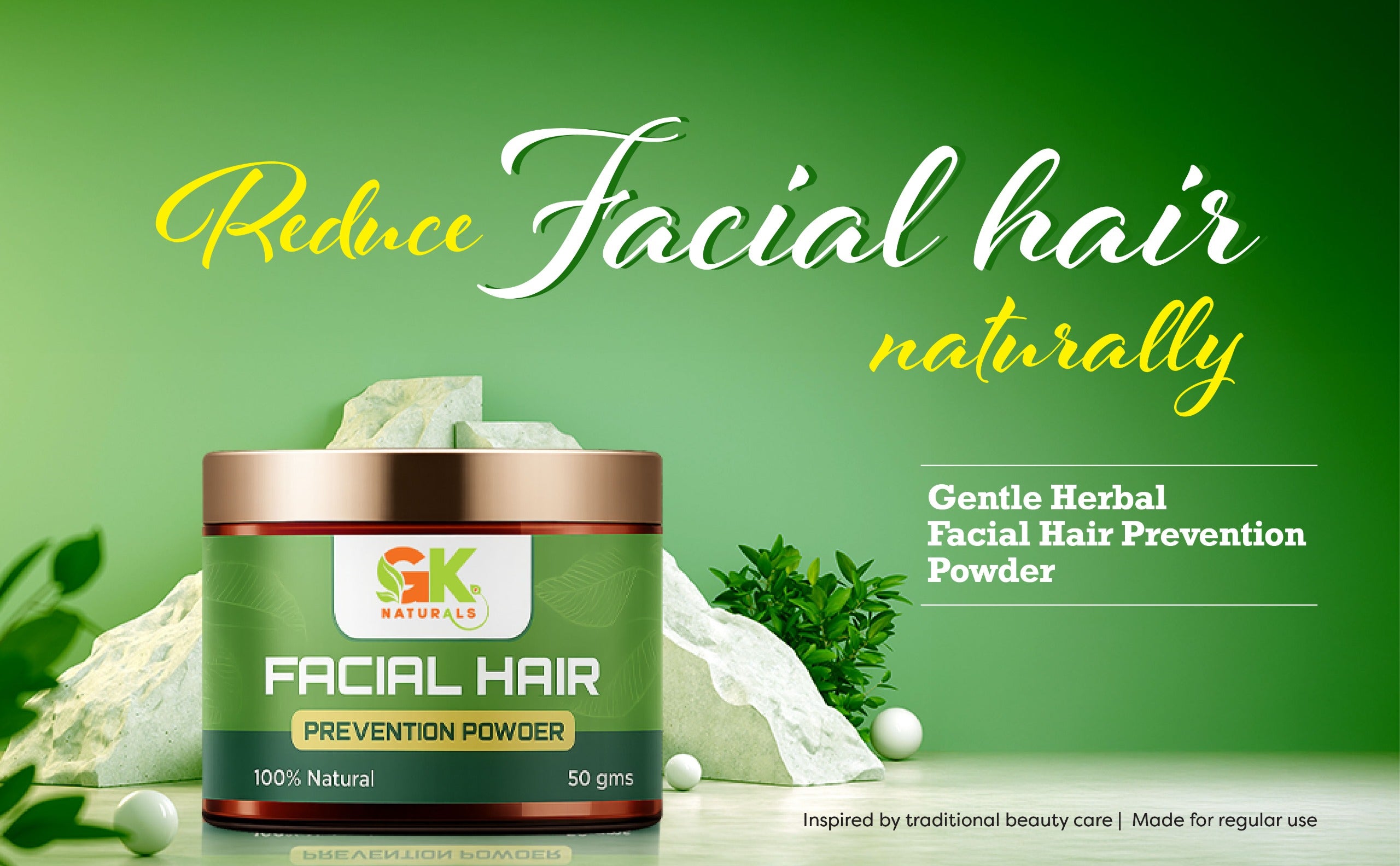 An Ayurvedic and innovative solution designed to help reduce unwanted facial hair growth. This powder is specially formulated to diminish the appearance of facial hair and provide a smooth, hair-free complexion. Contains ingredients like kasthuri manjal, Neem powder, kuppaimeni powder, and rose petal powder.